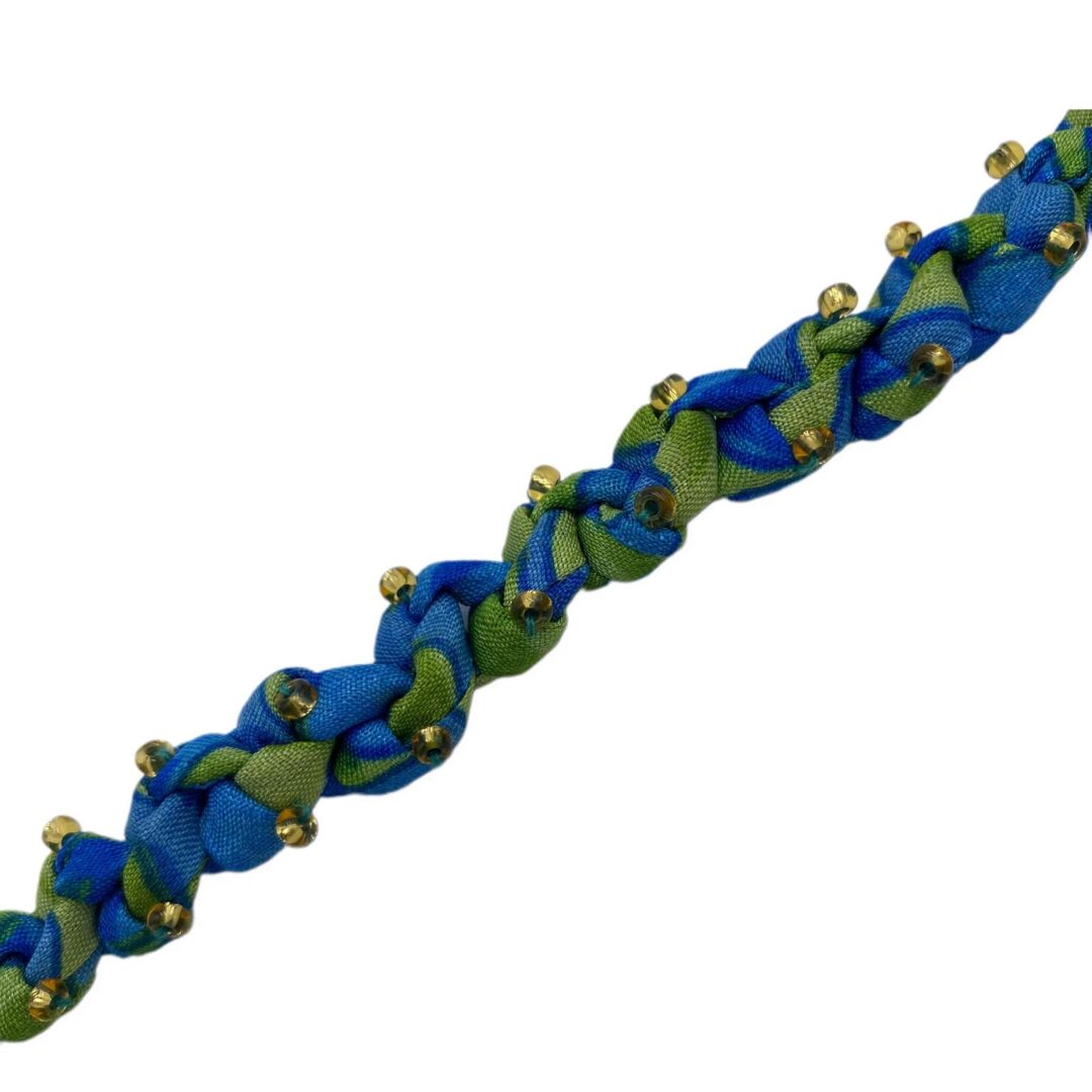 Dal momento che ricicliamo sari, la composizione di fabbrica del materiale originale può variare. I sari possono essere in seta, materiale sintetico, cotone o fibre miste. Per garantire la massima trasparenza, troverai la dicitura “100% fibre miste” in tutte le nostre etichette.